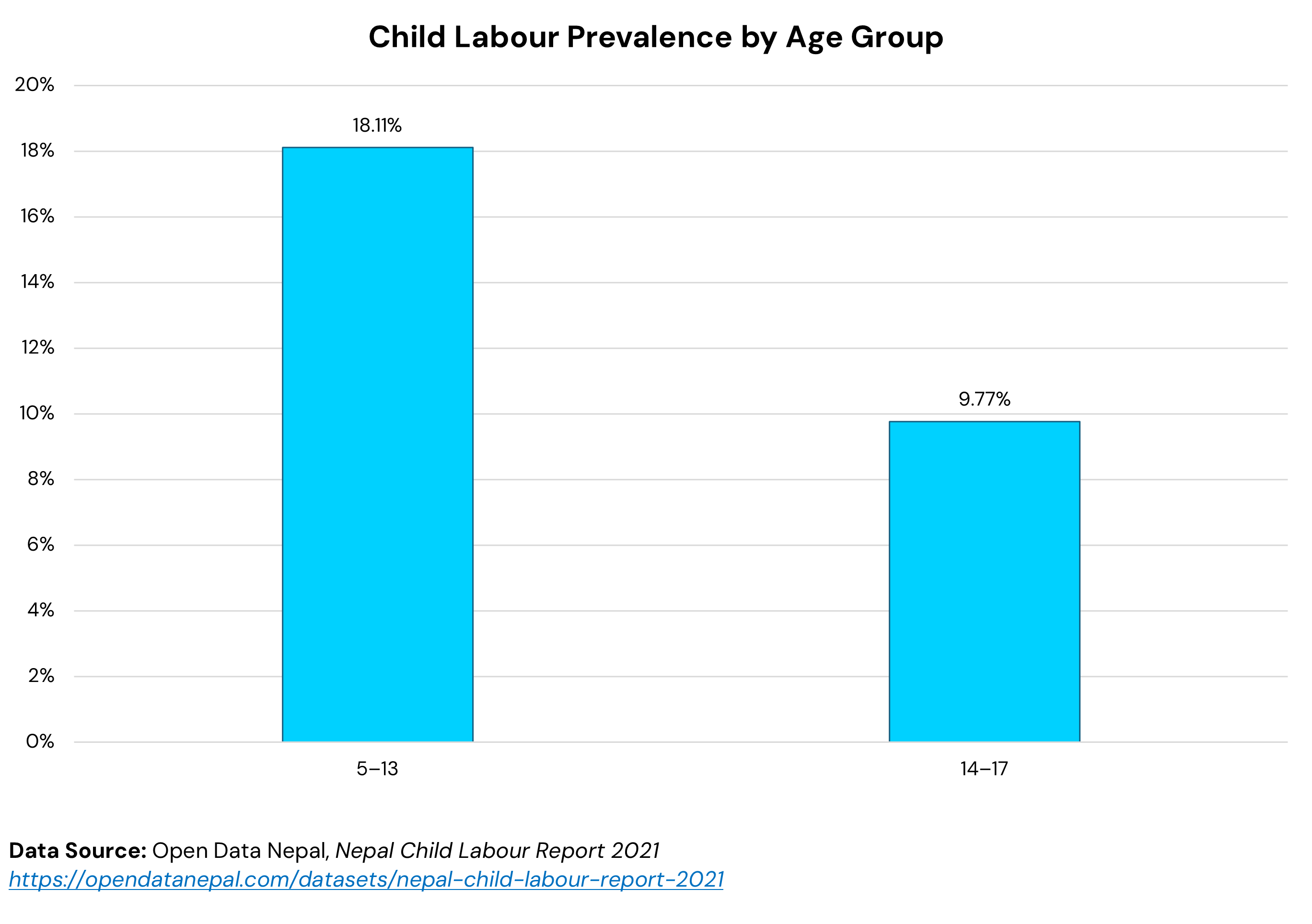 The data reveals a concerning pattern of early workforce participation among Nepal's youngest population. Children aged 5–13 years experience a child labour prevalence rate of 18%, nearly double the 10% rate observed among those aged 14–17 years. This age distribution suggests that many children begin working during their foundational developmental years, often supporting family agricultural activities or household enterprises.
