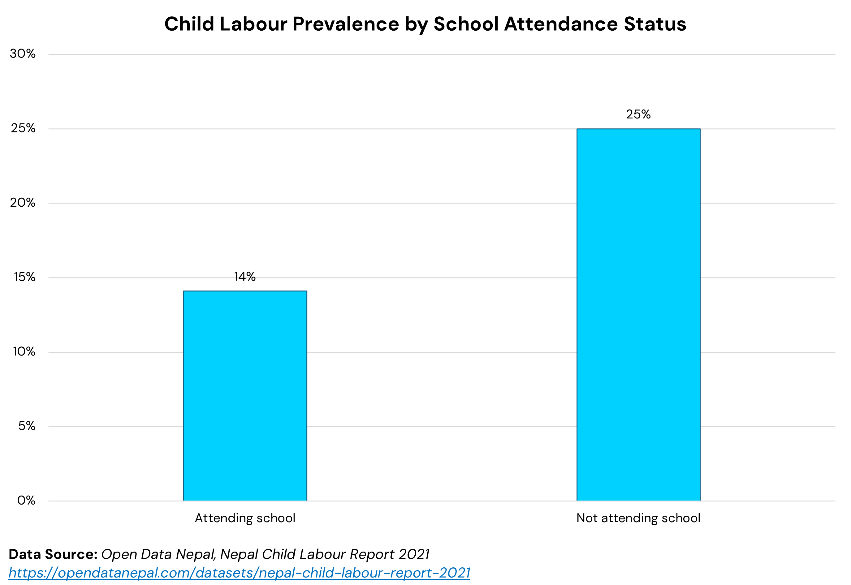 Child labour is notably higher among children who are not attending school. Among children aged 5–17 years, 14.1% of those attending school are engaged in labour, compared to 25.1% of those who are not in school