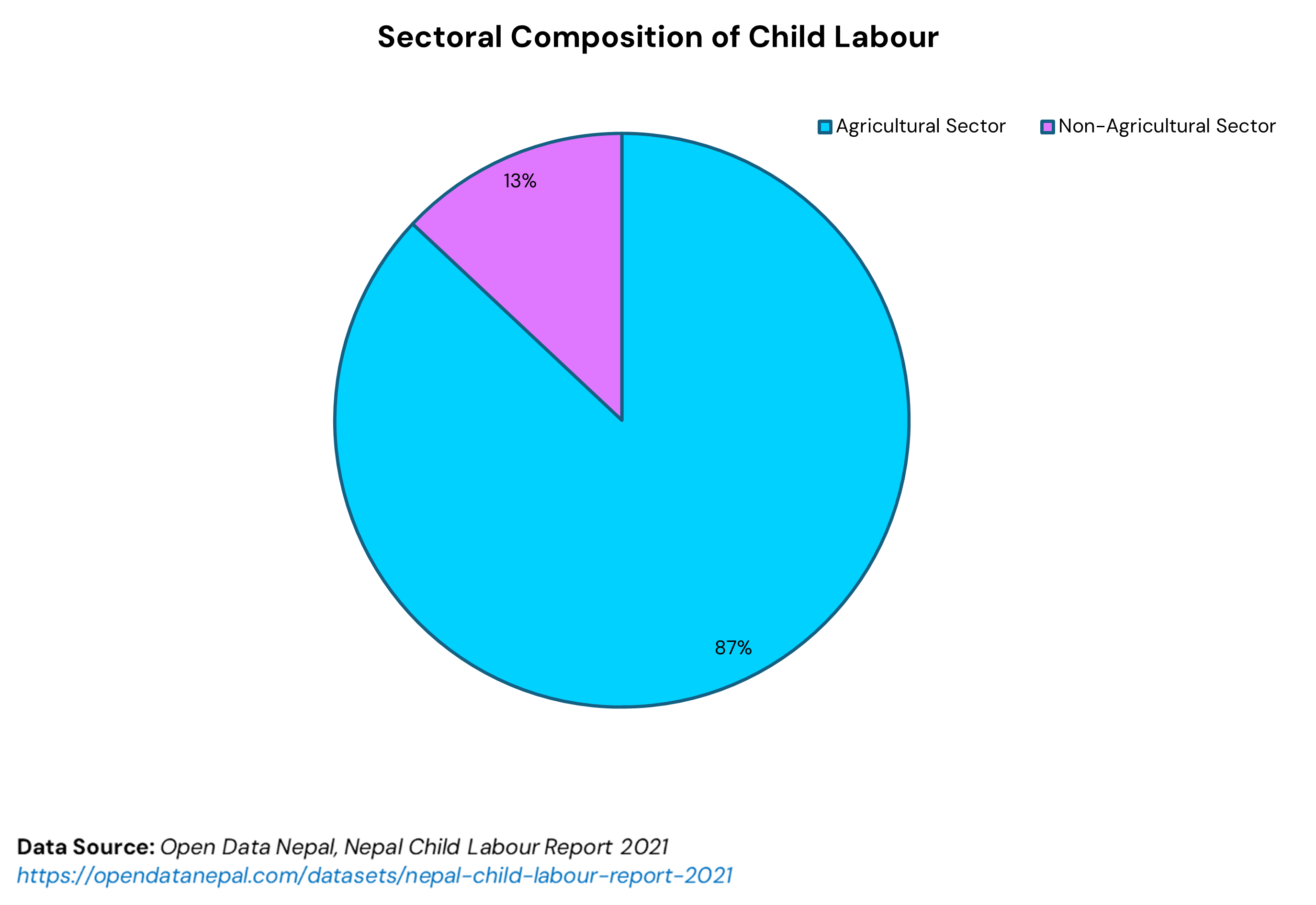 Agriculture accounts for 87% of all child labourers, while only 13% are engaged in non-agricultural sectors. Female children are more heavily represented in agricultural work, whereas male children are more prevalent in non-agricultural sectors, particularly in activities classified as hazardous.