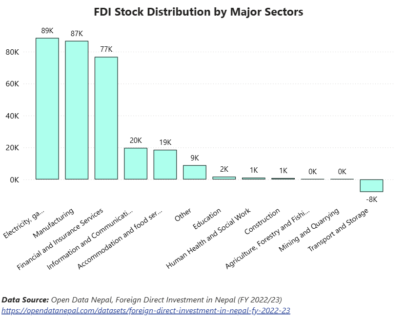This analysis is based on data from the Nepal Rastra Bank (NRB) and aggregated datasets on Foreign Direct Investment available through Open Data Nepal (ODN). The primary source of information is the Foreign Direct Investment in Nepal Report, FY 2022/23, published by the NRB.
