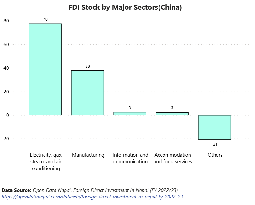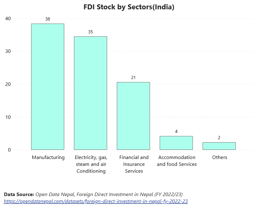 When you look closely, you can really see how differently India and China invest in Nepal. India puts its money into manufacturing, construction, and finance sectors that help build industries and strengthen trade networks. China, on the other hand, focuses mostly on energy projects, especially hydropower. It’s almost like two different playbooks for development: one driven by industry and commerce, the other by power and infrastructure. Together, these two countries make up nearly two-thirds of Nepal’s total foreign investment.